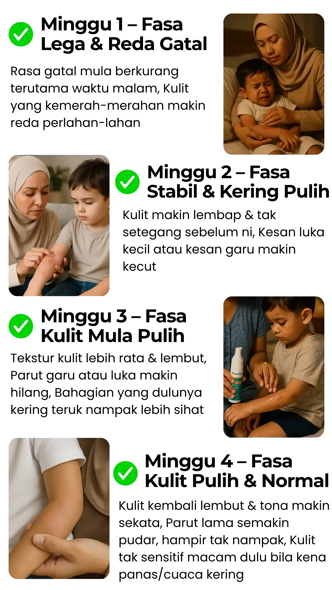 “Aunty ada ekzema dekat lipatan tangan, tiap kali berpeluh mesti pedih & gatal sampai susah nak tidur. Lepas guna Dermixa+, kulit makin tenang, dah tak merekah & gatal pun hilang.”